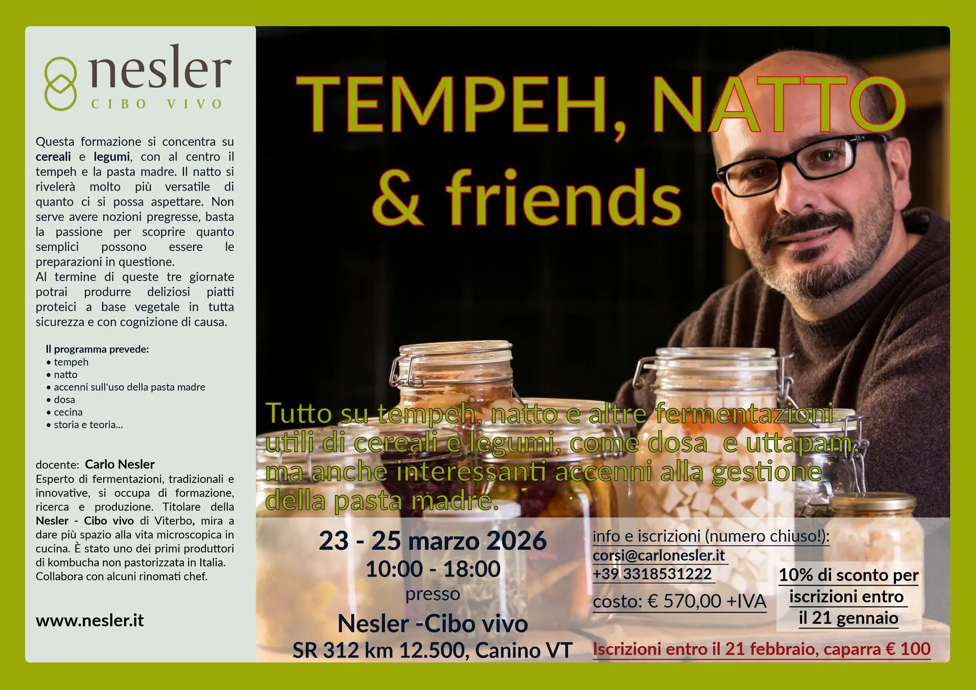 Questa formazione si concentra su cereali e legumi, con al centro il tempeh e la pasta madre. Il natto si rivelerà molto più versatile di quanto ci si possa aspettare.